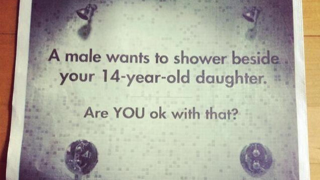 "A male wants to shower beside your 14-year-old daughter. Are YOU okay with that?"