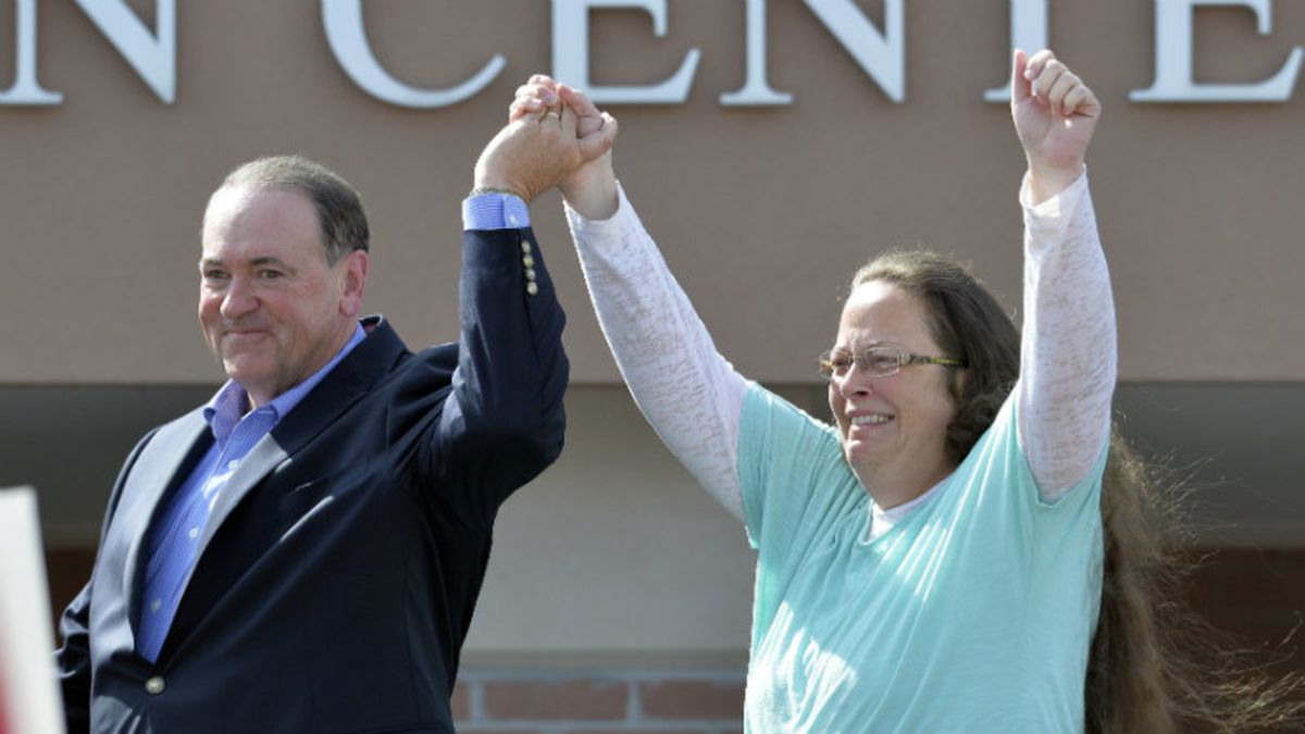 Davis was initially ordered August 12 to issue marriage licenses to four couples, two same-sex and two opposite-sex. (She’d directed her office to stop giving marriage licenses to anyone at all, because, once again, better for everyone to be unwed than for a gay or lesbian couple to enter into the hallowed institution Kim’s gamely attempted four times). On September 3, she was once again ordered to allow her office to grant marriage licenses, refused, and was jailed.
